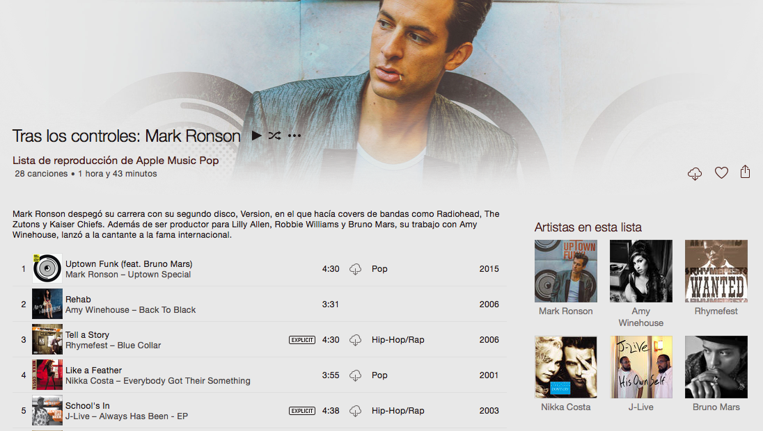 Otras listas interesantes creadas por Apple Music son las presentaciones de cada artista. Allí la manzana te selecciona las canciones que debes oír para conocerlo. También están las llamadas listas ‘Tras los controles’, curadas por los productores de muchos de tus álbumes favoritos. Mi favorita es la de Mark Ronson, en donde encuentro música de Amy Winehouse, Bruno Mars, Lily Allen, entre otros.