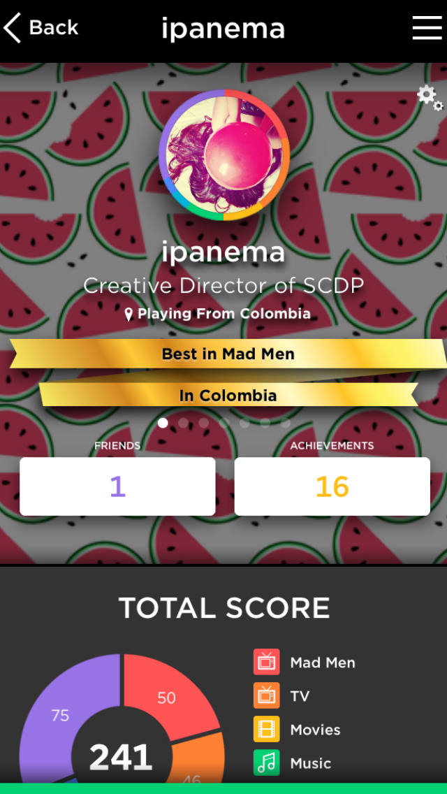 Otro juego móvil que está muy bien hecho y en el que puedes pasar mucho tiempo sin aburrirte. Quizá por los seres competitivos que llevamos dentro, es interesante el concepto de jugar con extraños a resolver preguntas sobre cosas que nos interesan. Yo, por ejemplo, soy la mejor de ‘Mad Men’ en Colombia. ¿Lo han jugado? (iOS y Android).