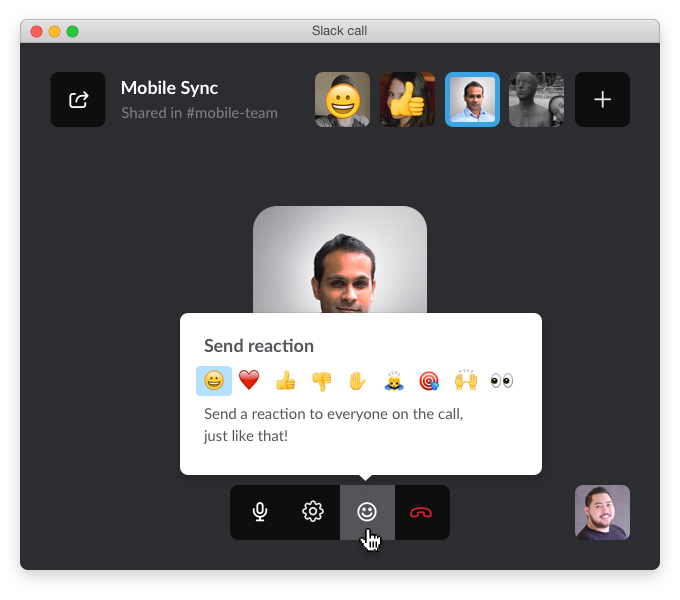 También puedes responder con emojis en tus llamadas, los cuales aparecerán en tu imagen de perfil en Slack durante un momento sin interrumpir a la persona que está hablando, como se puede ver en esta imagen: