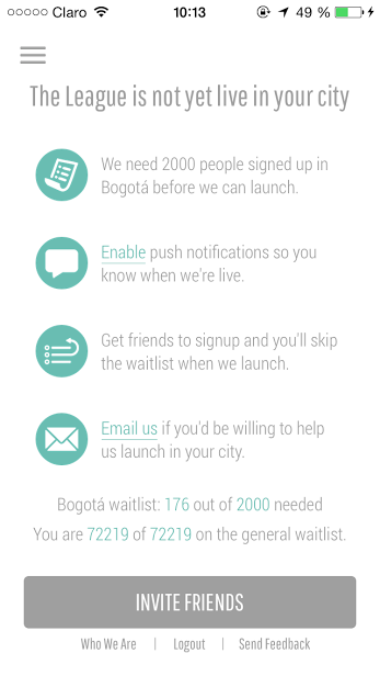 Nuestro registro significó ser la persona número 72.219 de la lista en espera en general de la aplicación en todo el mundo. Como reporta Business Insider, The League llegó a los 2,1 millones de dólares en capitalización, provenientes de inversores de Sillicon Valley, y por ahora opera en su primera ciudad: San Francisco.