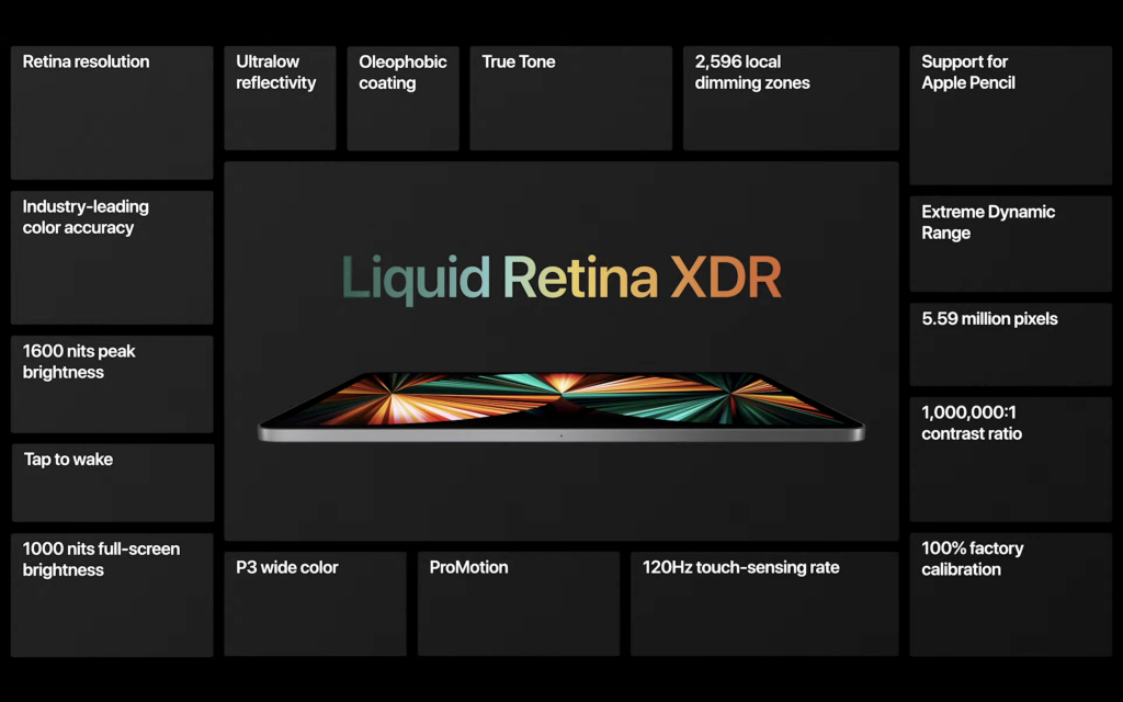 La cámara tiene un lente Ultra angular de 12 megapíxeles que con un sistema de inteligencia artificial mantiene al sujeto en el centro de la pantalla y cuando entran otras personas durante una videollamada hace zoom-in o zoom-out automáticamente para adaptarse. Además, tiene una nueva retina liquida XDR que mejora la experiencia visual del iPad y cuenta con tecnología MiniLed en la pantalla. Esta ayuda a mejorar los colores y el brillo en la pantalla a la vez que da mayor contraste en las zonas negras, comparado con las pantallas LCD de las versiones anteriores.