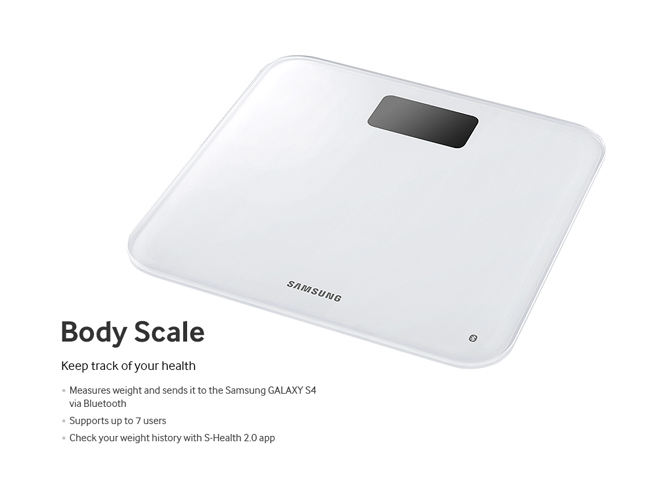 Esta balanza se conecta al S4 para la medición y supervisión del peso del usuario, y lo mantiene informado de los progresos realizados. La información es enviada al teléfono vía Bluetooth y la aplicación S Health 2.0.