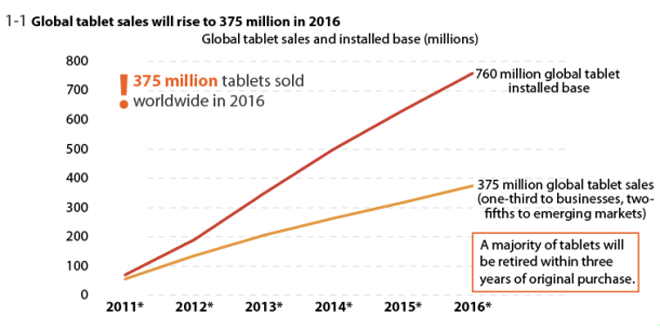 Este reporte fue escrito por Frank Gillette, analista principal de la compañía en tecnología de negocios a futuro, y en él afirma que este nivel de ventas implicaría una tasa de crecimiento anual de 46% y que para esa fecha existirían 760 millones de tablets en uso, todo gracias al avance que se dará con estos dispositivos.