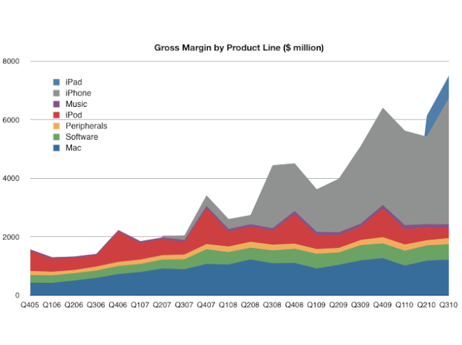 Así mismo, Asymco publicó otro informe que revela cuáles productos de Apple son los más rentables para la empresa y le producen más ingresos. Definitivamente, el iPhone es el rey, que le da un margen de ganancias del 57%. Sin este producto, dice Asymco, la compañía no habría tenido un crecimiento importante desde el 2007.