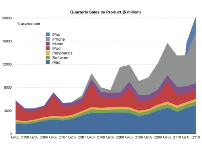 Para confirmar el gran acierto de Apple en el mercado de la mano de Jobs, circula por estos días en la Web un estudio de la firma de investigaciones Asymco que analiza de dónde provienen los ingresos de la compañía de la manzana en los años más recientes. El gráfico es diciente y su título original (que es el mismo que empleamos en este artículo) demuestra por qué la empresa ha puesto tanto empeño en promover su teléfono inteligente iPhone y el computador tablet iPad, los cuales le representan a Apple gran parte de sus ventas en la actualidad.