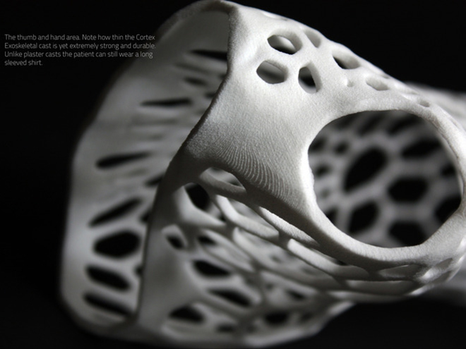 ‘Cortex’ es una férula que se crea en una impresora 3D y funciona como exoesqueleto para el brazo fracturado. La fibra plástica en la que se imprime busca que el accesorio sea ligero, tenga un diseño cómodo y pueda ser lavable y reutilizable. De esta forma, el usuario puede usar su ropa de forma normal, bañarse, y no preocuparse por tener un kilo de peso inerte en el brazo.