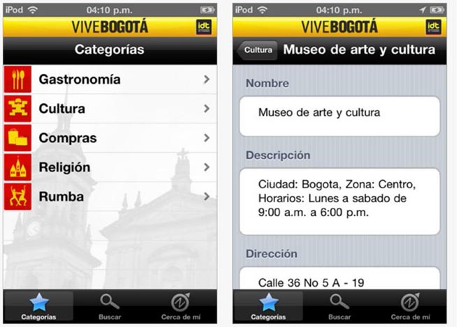 Si vino a la ciudad a disfrutar de la fiesta del teatro pero aun no se mueve y conoce Bogotá, esta aplicación es una guía completa de la ciudad que le mostrará los sitios de interés más cercanos con ayuda del GPS y la información para acceder a ellos. Es gratuita y funciona teniendo como mínimo iOS 3.1.