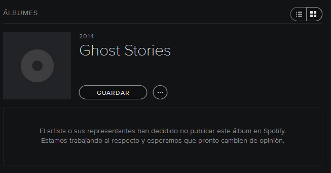 Si un usuario intenta buscar ‘Ghost Stories’ en Spotify encontrará el siguiente mensaje: