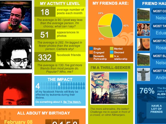 Entre los datos que muestra My Social Strand están el tiempo que lleva viva la persona, algunos indicadores de su nivel de interacción en Facebook, cifras básicas sobre el estado civil y la actividad de sus contactos, las canciones número uno en el momento de su nacimiento y en el inicio de su relación actual –si la tiene– y un pequeño perfil sicológico que le permite al usuario compararse con lo que, según el sitio, es el resto de la humanidad. Alguna de la información, por desgracia, solo funciona bien para usuarios estadounidenses.