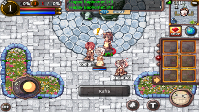 Lo primero que se nota es el estilo clásico de las gráficas de los juegos de RO, que se diferencia de la otra versión móvil de Ragnarok (RO: Violet) la cual tenía sprites más curvos y detallados. En esta ocasión volvemos a una sensación más pixelada, con personajes más sencillos. También recuperamos el mini mapa, una caja más amplia de comandos rápidos, y la zona de chat. Como un plus más el joystick de movimiento de personaje se siente comodo al utilizarlo (en un Samsung Galaxy S3), y tiene la opción de ocultarse si uno prefiere mover el personaje a punta de tocar donde quiere que el muñequito vaya. El botón de acción es una carita ubicada en la parte inferior derecha, que cambia de muerto a una expresión cuando se puede interactuar con un NPC o un monstruo. El movimiento entre menus es muy intuitivo, sólo hay que tocar el nivel del personaje para moverse entre items, habilidades, y los demás menús. El registro de comandos rápidos es sencillo y más organizado que antes.