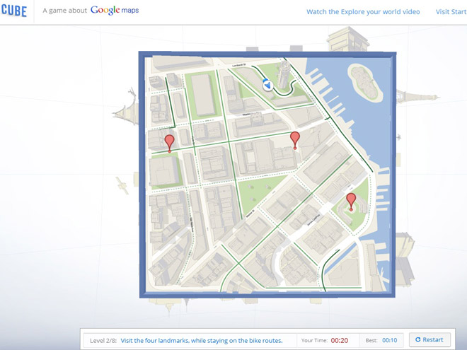 La idea es que los usuarios muevan un gran cubo con la ayuda de su ratón y conduzcan a una pequeña bola azul por las calles de un escenario en 3D hasta el destino que indica el juego, todo con la intención de mostrar a los usuarios la mejor forma de sacar provecho al servicio de mapas.