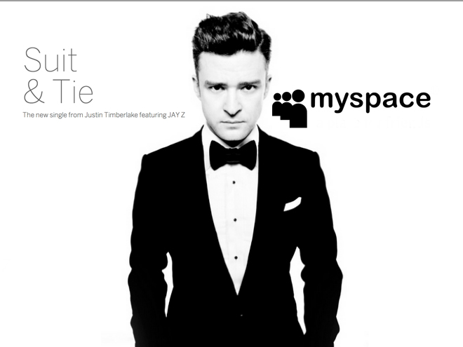 Al entrar a la pagina de inicio de MySpace aparece Timberlake haciendo promoción de su mas reciente sencillo, Suit & Tie. Todos los usuarios de la red social podrán descargar la canción de manera gratuita. De hecho, MySpace no es el único que regresa. El ‘single’ marca el regreso de Timberlake a la música, luego de varios años sabáticos.