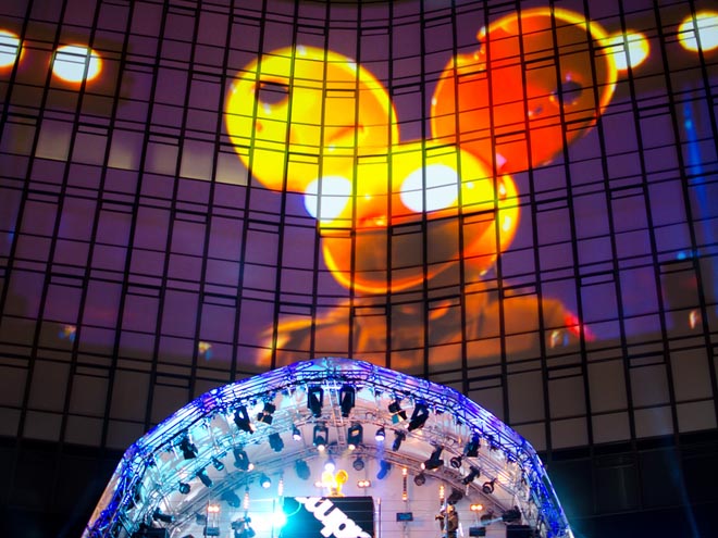 Muchos de los visuales aparecían no solo en el cubo en el que Deadmau5 estaba tocando para los asistentes, sino en el casco con forma de ratón que proyecta imágenes según la música y se combina con lo que se proyecta en el escenario.