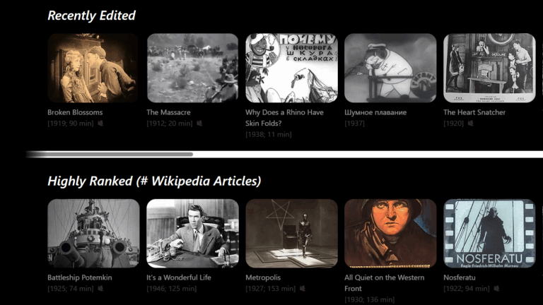 Lo que se encuentra en WikiFlix es, sobre todo, historia del cine. Películas de las primeras décadas del siglo XX, obras del expresionismo alemán como Metrópolis (1927), cine mudo, clásicos del terror, dramas, westerns y producciones que, en su momento, marcaron hitos culturales. También es posible explorar el catálogo por años, géneros, premios o figuras clave del cine, como directores y actores.