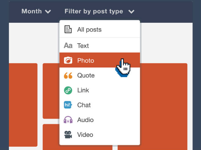 Los usuarios de Tumblr se pondrán muy contentos al saber que ahora, cuando ingresen al archivo de sus blogs o, de otros blogs, van a tener una opción de filtrar el tipo de contenido que quieren que les aparezca según el mes seleccionado.