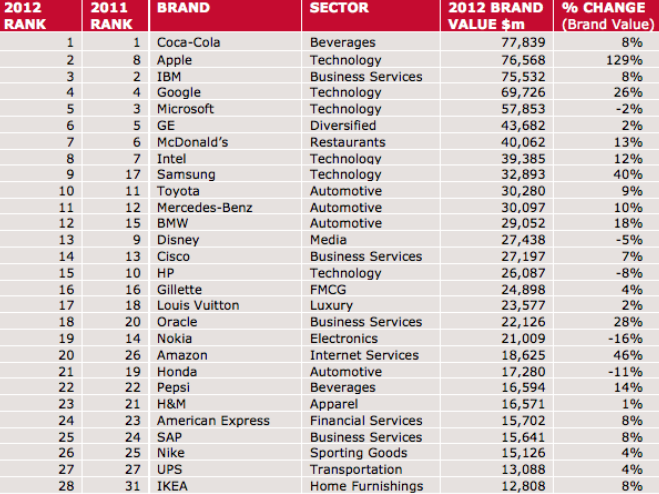 Interbrand, una de las agencias de marca más importantes del mundo, anualmente publica un listado con las marcas más reconocidas. Este año, a pesar de que Coca-Cola mantiene el primer lugar, la sorpresa la dio Apple, que subio seis puestos, pasando de la octava posición a la segunda. Según la agencia, la marca Apple hoy en día cuesta 76.568 millones de dólares, un incremento del 129% frente al valor de 2011.