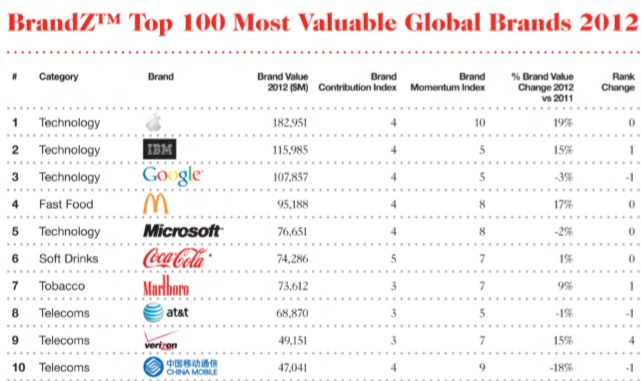 El estudio hecho por Millward Brown elaboró un listado de las 100 marcas más valiosas. Gracias a las ventas del iPhone y del iPad, Apple incrementó su valor de marca un 19 por ciento en el último año, llegando a la suma de 183.000 millones de dólares.