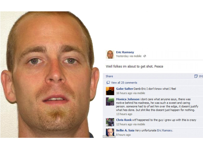 Al verse acorralado por la autoridades, Ramsey publica un estado en Facebook desde su celular: “Bueno amigos, estoy a punto de recibir un disparo. Paz.”, dicho esto es abatido y dado de baja por las autoridades, y por la forma en que ocurrieron los hechos pareciese que Eric hubiera deseado ese fatídico final. Una vez más las redes sociales son testigos de muertes trágicas.
