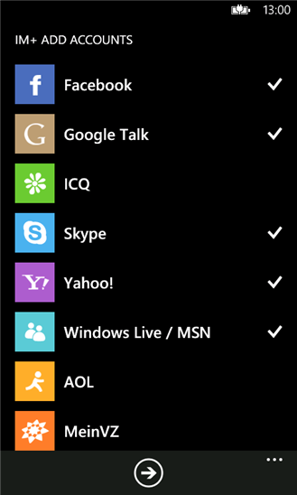 IM+ es uno de los mejores clientes de mensajería instantánea que tiene la tienda de aplicaciones de Windows Phone, es compatible con todos los servicios más utilizados, entre ellos se encuentra el chat de Facebook, Skype, Google Talk, Yahoo!, AIM, ICQ, entre una decena más.