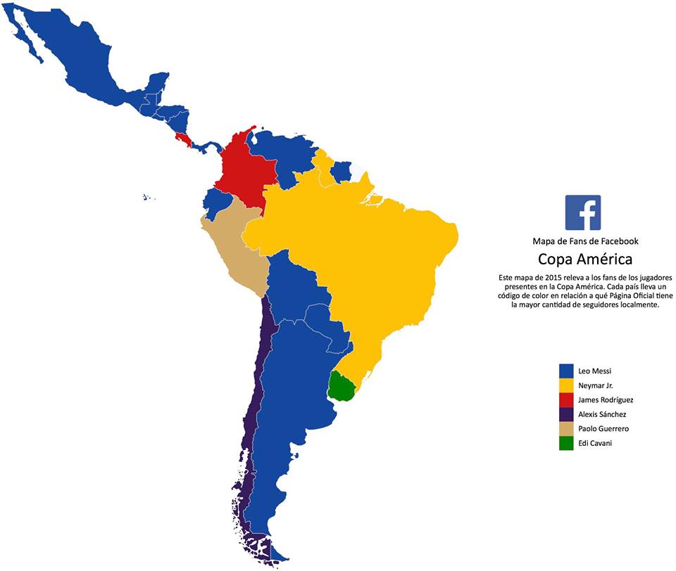 “Para medir la temperatura de la afición en vísperas del torneo Facebook analizó las páginas oficiales de los jugadores para determinar qué futbolistas son más admirados en cada país de la región”, explicó la red social.