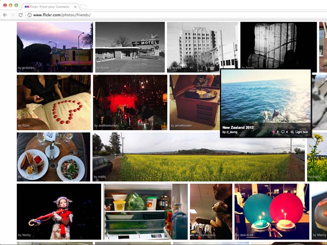 Flickr, la red social de fotografía más popular del mundo, prepara su rediseño más radical en años. Según reveló Mashable, el cambio más importante que tendrá el sitio es un nuevo despliegue de la galería de cada usuario en el que las imágenes se mostrarán a lo ancho de la pantalla. La información de texto, como los ‘tags’ (etiquetas) o el título de cada foto, estará oculta por defecto y aparecerá si el usuario pone el cursor encima de la imagen.