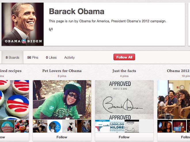 Cuatro años después, repite esa estrategia en busca de su reelección. Esta vez el presidente-candidato está buscando votos en Pinterest, la red social que más atención está ganando hoy en Internet. Su campaña puso al aire un perfil en el que comparte, entre otras cosas, fotos de sus partidarios, de su familia y de los eventos políticos en los que Obama participa, al igual que una sección de documentos e infografías sobre su mandato.
