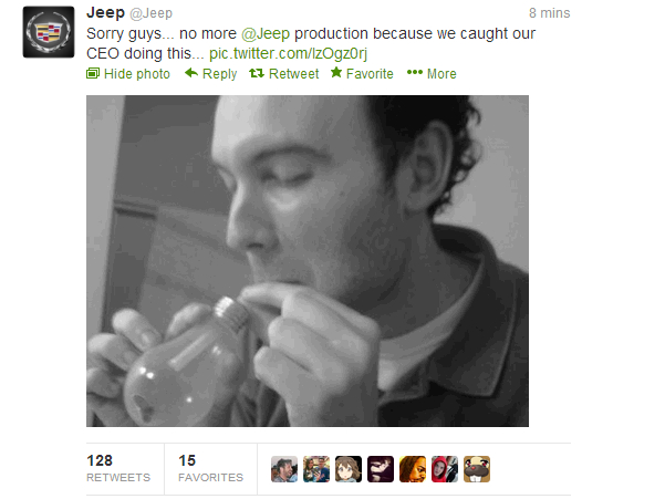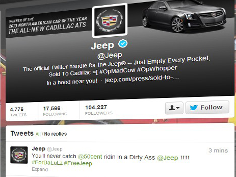 La marca Jeep es la víctima (@Jeep). El ‘modus operandi’ fue igual: la cuenta fue permeada, la foto de perfil fue cambiada, el identificador fue usurpado por el de otro fabricante norteamericano, Cadillac. Y en adicion a lo anterior, por un par de minutos el fondo de pantalla de la cuenta fue un automóvil pintado de colores como los de McDonald’s, haciendo alusión a lo ocurrido el día anterior.