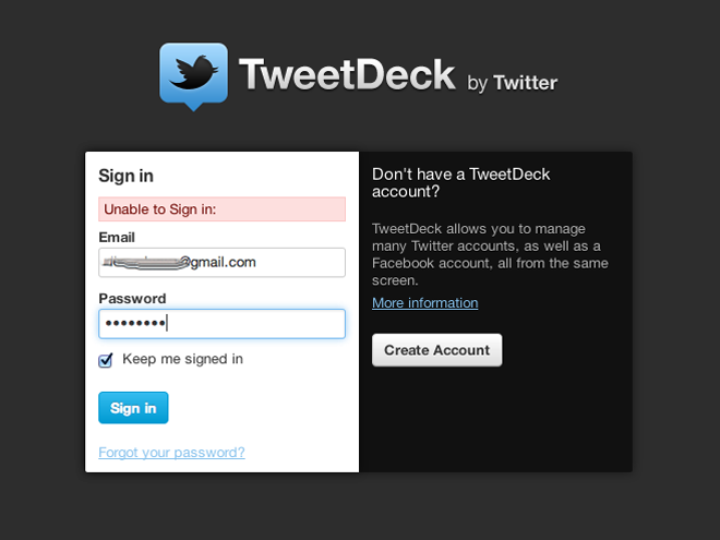 Después de que un usuario reportara la presencia de un error de programación en TweetDeck, Twitter decidió apagar el servicio. Según confirmó TechCrunch Geoff Evason, un usuario de TweetDeck en Sidney, asegura que descubrió que podía acceder a cientos de otras cuentas a través del servicio.