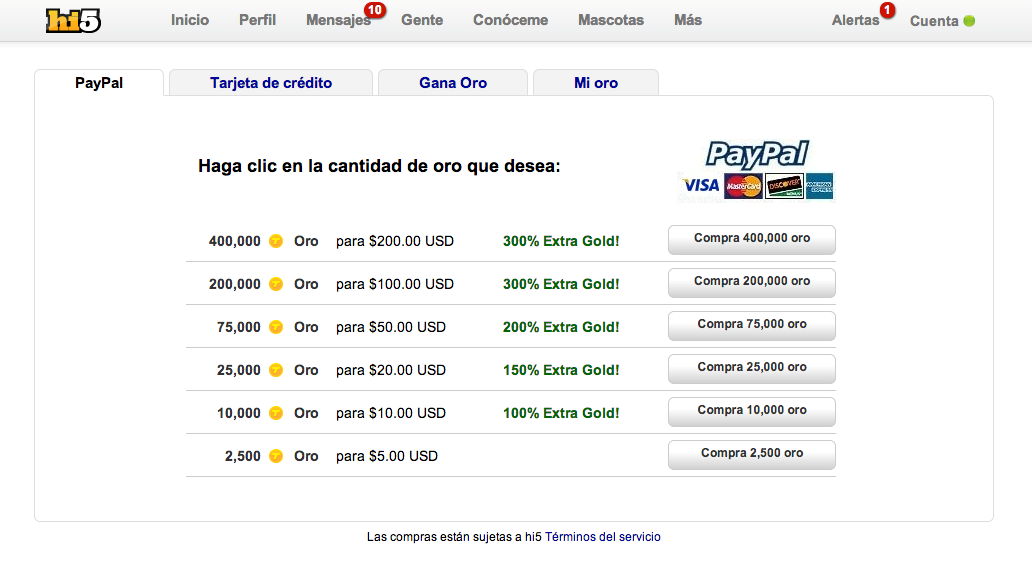 Lo de las mascotas es un enredo. En la plataforma tienes dinero virtual que te permite comprar ‘mascotas’. Es decir, otros usuarios. Entre más veces te compren, tu valor en la red social se incrementará. Podrás tener mayores beneficios si compras oro, que por increíble que parezca, maneja estas tarifas: