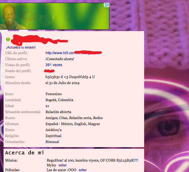 Hi5 ya no es un sitio para adolescentes, ni mucho menos para conocer gente a nuestro alrededor. Allí encontramos numerosos pretendientes de múltiples países como Turquía, Jordania, Arabia Saudita, Trinidad y Tobago, Chile, España y muchos más. Muchos superaban los 50 años, eran casados y tenían fotos que evidentemente no correspondían con la edad que marcaban en su perfil.