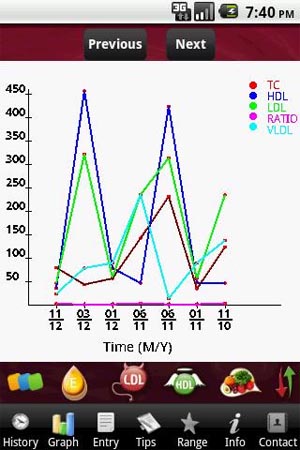 Cuando el paciente debe controlar regularmente sus niveles de colesterol, es útil llevar un registro de cómo es el avance o retroceso de los niveles. Eso le permite medir si el tratamiento que está siguiendo es efectivo o no y consultar con su médico sobre la base de números ciertos. Esta aplicación para Android permite hacerlo: muestra en una gráfica los resultados históricos del paciente, compara las cifras de diferentes maneras y señala cuáles son los valores óptimos. Es gratuita y se puede descargar de Google Play Store.