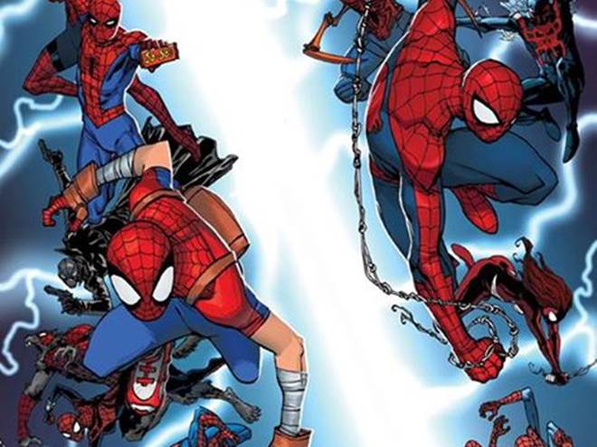 El primer gran giro para el mundo de los cómics de superhéroes en 2015 llegó el pasado miércoles, con la publicación de la cuarta parte de ‘Spider-Verse’, la saga que reúne a todos los Spider-Man de todas las dimensiones que hemos conocido: 2099, Ultimate, manga, Earth X, Noir, etc. La saga es escrita por Dan Slott y trae de vuelta a villanos como Morlun y Daemos (y todo su clan), quienes estan cazando a todos los Spider-Man que han existido.
