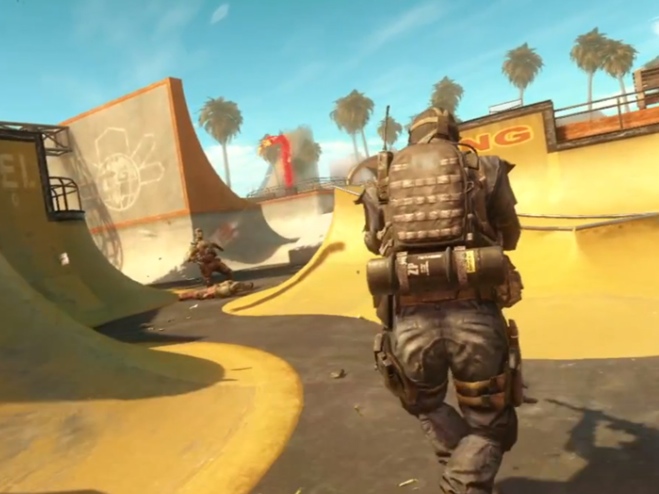El segundo mapa del paquete se llama Grind y rompe la línea de diseño de los juegos anteriores. La pelea se desarrolla en medio de rampas y tubos, propios de un parque de skate. Grind es un parque para patinadores en Venice Beach, California -donde dicen que nació el fenómeno de patinar- y con color vivido, lo que cambia un poco el diseño tradicional de Call of Duty.