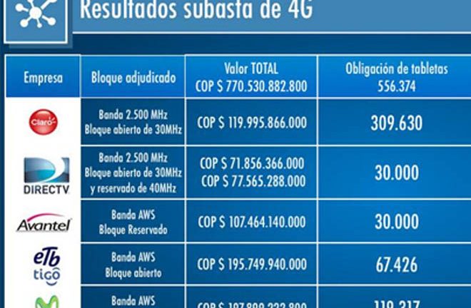 Con este resultado, Colombia queda con seis operadores de datos móviles en 4G: los cinco adjudicatarios de la subasta del miércoles y UNE, quien ya tiene espectro de 4G LTE.