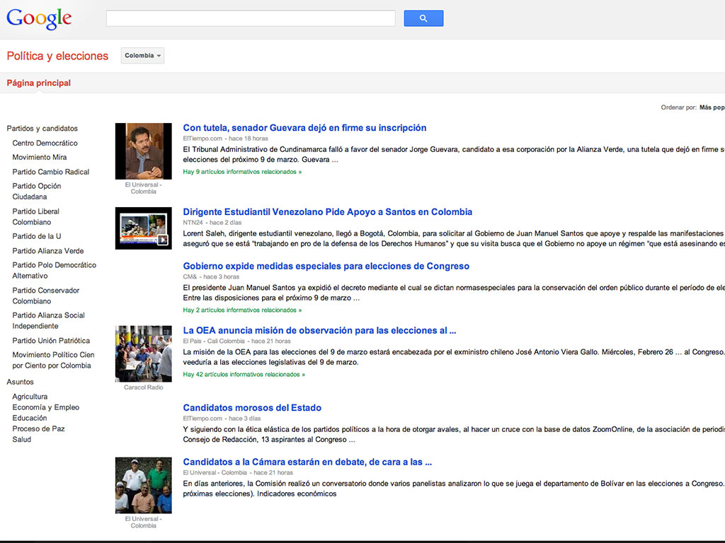 La sección de ‘Politica y elecciones de Google’ cuenta con un hub que muestra las noticias más recientes del proceso de elecciones y de los partidos políticos. Estas noticias pueden ser filtradas en los menús laterales, donde podrán seleccionar la información de un partido en especifico o buscar las noticias según los temas tratados con respecto a un asunto en específico (salud, educación, economía, etc…).