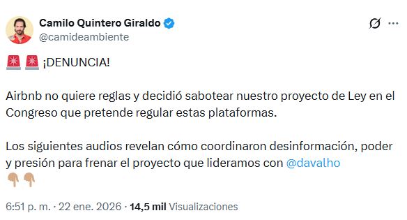 En su cuenta de X (Twitter), Quintero Giraldo publicó una serie de audios obtenidos en los que se puede escuchar a una persona, a quien él identifica como un “alto ejecutivo” de Airbnb, hablar con un grupo de personas y plantear los diferentes mecanismos para frenar la propuesta que él y Daniel Carvalho, representante a la Cámara por Antioquia, presentaron el año pasado.