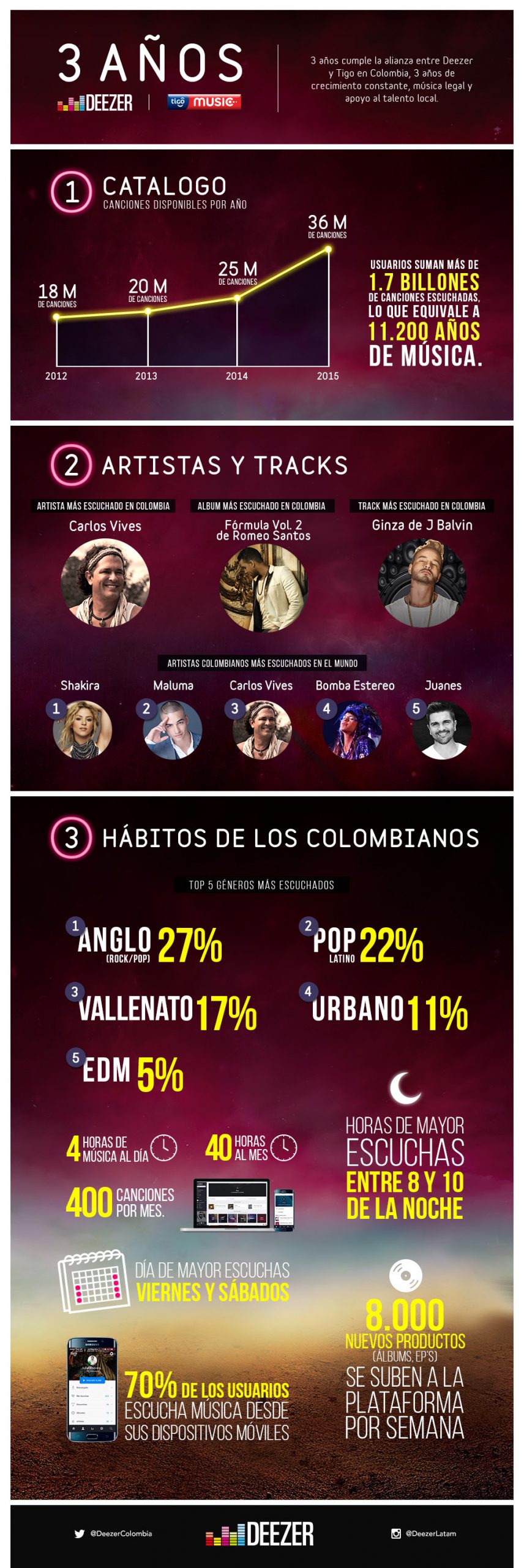 Deezer, la plataforma de streaming francesa, celebra sus tres años de existencia en nuestro país. Si bien Deezer es la plataforma de streaming que tiene mayor presencia territorial en el mundo (más de 180 países), Colombia es uno de los mercados en donde tiene mucha popularidad, en gran parte gracias a la alianza que tiene con el operador móvil, Tigo, desde octubre de 2012.