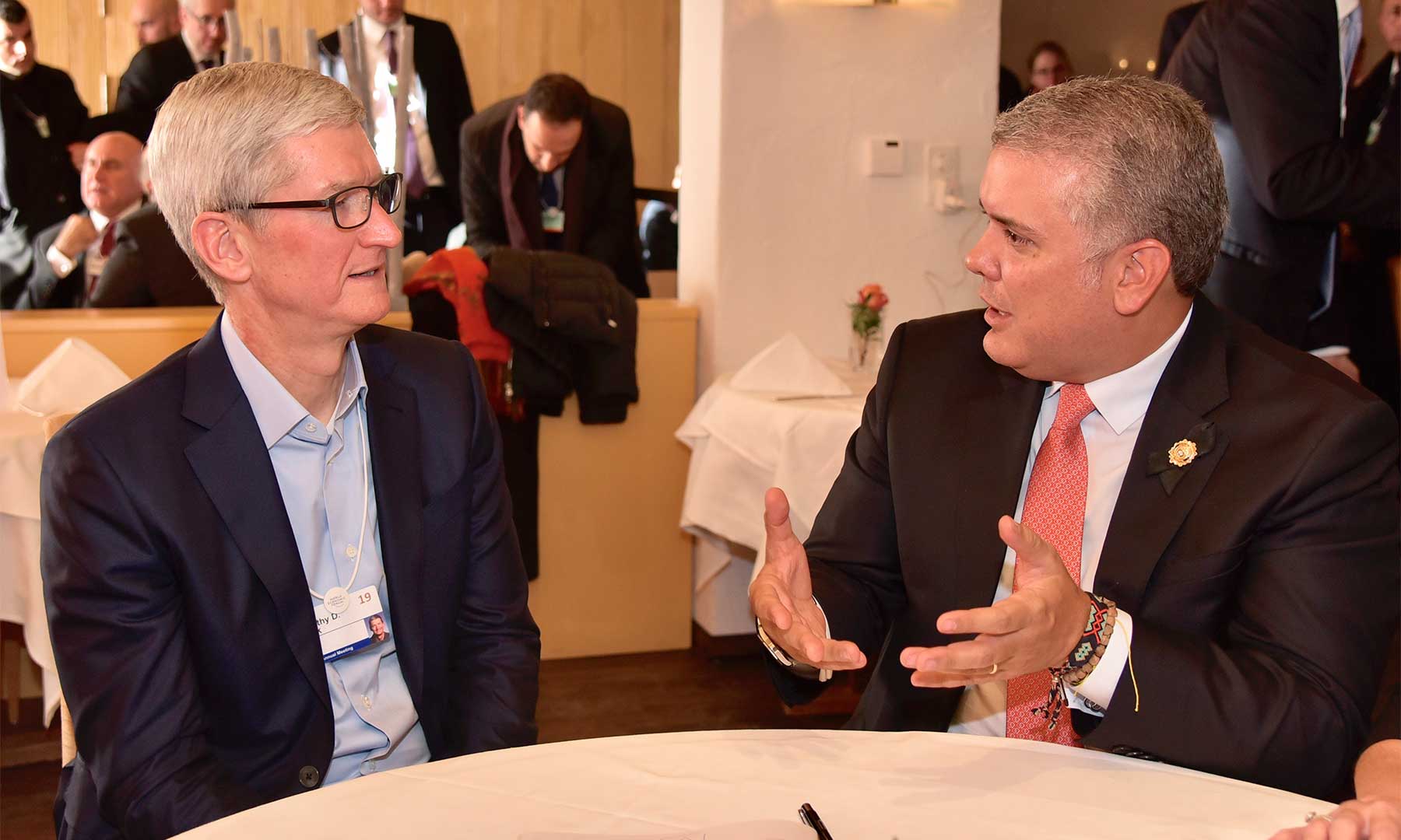 De acuerdo con un comunicado de presidencia, durante la reunión del presidente Iván Duque con Tim Cook, CEO de Apple, se habría demostrado interés por parte de la empresa en apoyar el sistema educativo en Colombia, “en los programas de entrenamiento de profesores y en acercar la tecnología a los niños, especialmente en lugares apartados del país”, explicó el mandatario.