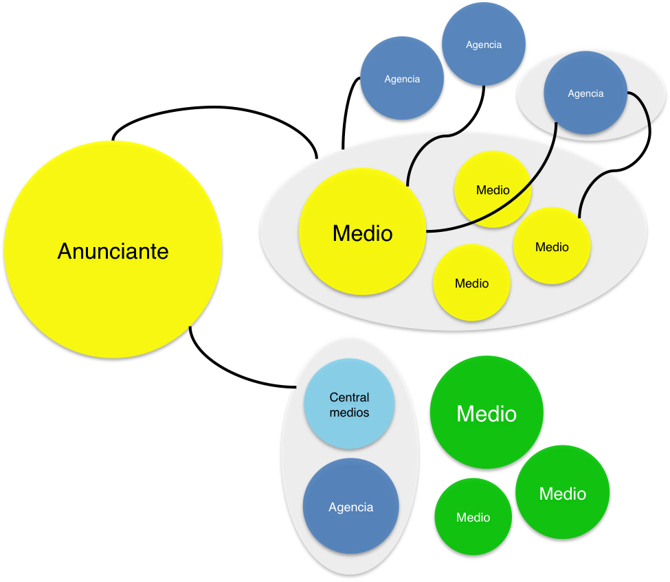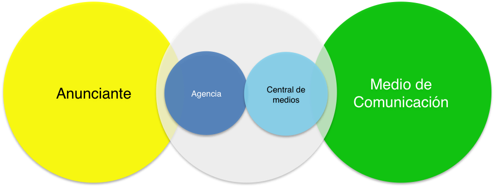En este ‘marketplace’ el anunciante invierte un monto de dinero en publicidad para llegarles a las audiencias que están consumiendo el medio de comunicación. Entre estos dos actores están la agencia creativa y la central de medios. La agencia cumple el papel de estratega creativo y construye una campaña de publicidad para que las audiencias del medio consuman el producto o servicio del anunciante. El papel de la central de medios es intermediar la compra del anunciante para optimizarla y planear una ejecución en función de los objetivos del anunciante.
