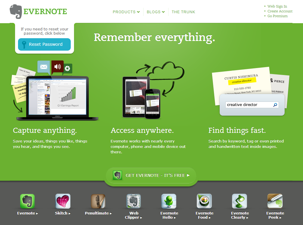 Evernote es otra herramienta de productividad gratis preferida por el público. Te permite capturar ideas, pensamientos e imágenes de varias formas, como notas de voz, notas escritas o imágenes. Puedes grabar tus reuniones, entrevistas, discursos e ideas, crear listas, agregar adjuntos de voz o texto, y compartir tus archivos con amigos o colegas. También puedes sincronizar Evernote con Remember The Milk para optimizar tu tiempo.