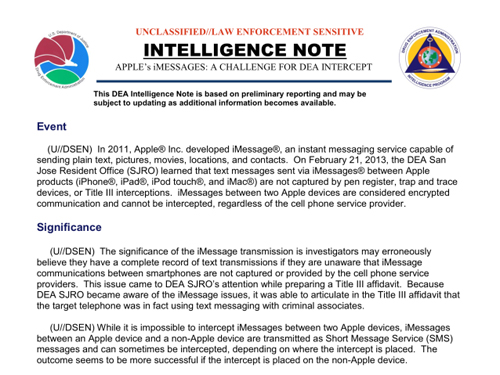 iMessage tiene como función el envió de mensajes gratuitos entre dispositivos Apple, y según un documento interno de inteligencia que hizo publico CNET, la DEA afirma “es imposible interceptar los mensajes (iMessage) que se produzcan en dispositivos Apple”.