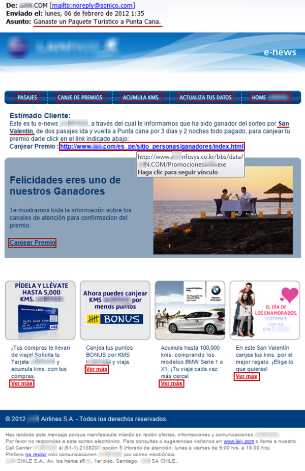 En la segunda semana de febrero comenzó a propagarse una variante del gusano Win32/Dorkbot.B, cuyo indice de detección tuvo un gran crecimiento en Latinoamerica. El código malicioso entraba a los computadores por medio de un falso boletín de una aerolínea chilena que premiaba con dos pasajes a Punta Cana. El gusano logra, entre otras cosas, convertir a los equipos infectados en parte de una red botnet, robar credenciales de acceso de los usuarios y realizar ataques de estafa contra bancos de la región.