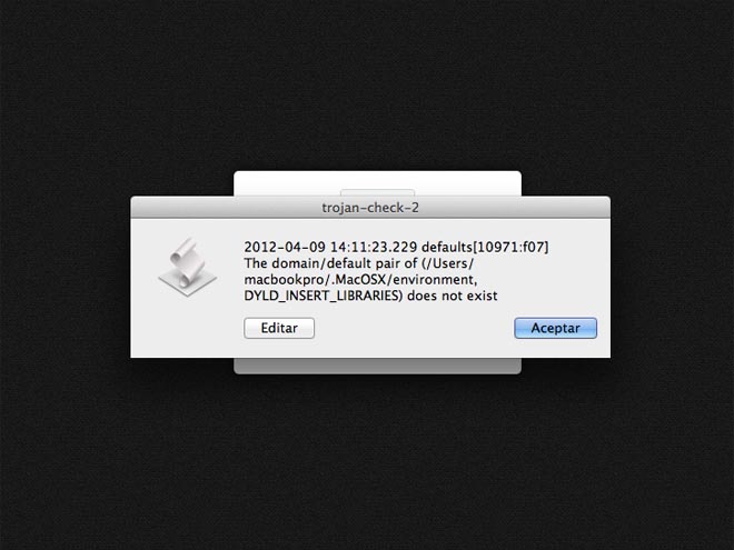 CloudApp desarrolló una pequeña aplicación para saber si su Mac está o no infectado con el troyano. Simplemente es cuestión de descargar este DMG y ejecutar los dos archivos que están en él: ‘trojan-check’ y ‘trojan-check-2’. Si en las dos ocasiones les sale la siguiente pantalla, no hay nada de qué preocuparse: