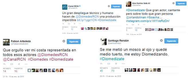 Tal como señala el comunicado, por el lado de ‘Diomedes’, “#Diomedízate fue el hashtag oficial que promovió el canal RCN para iniciar la conversación en Twitter donde las cuentas oficiales del canal y algunas celebridades registraron el lanzamiento:”