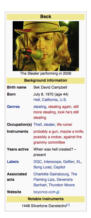 Pero no solo Kanye está enojado con la pérdida de ‘Queen Bey’. Ahora, como reporta Mashable, seguidores de la cantante empezaron a modificar la página de Beck en Wikipedia, acusándolo de robo, poniéndole nombres como el hombre que le robó el Grammy a Beyoncé, así como poniendo en su sitio web la página de Beyoncé, entre muchas cosas. Pueden ver todo eso en esta graciosa captura pantalla: