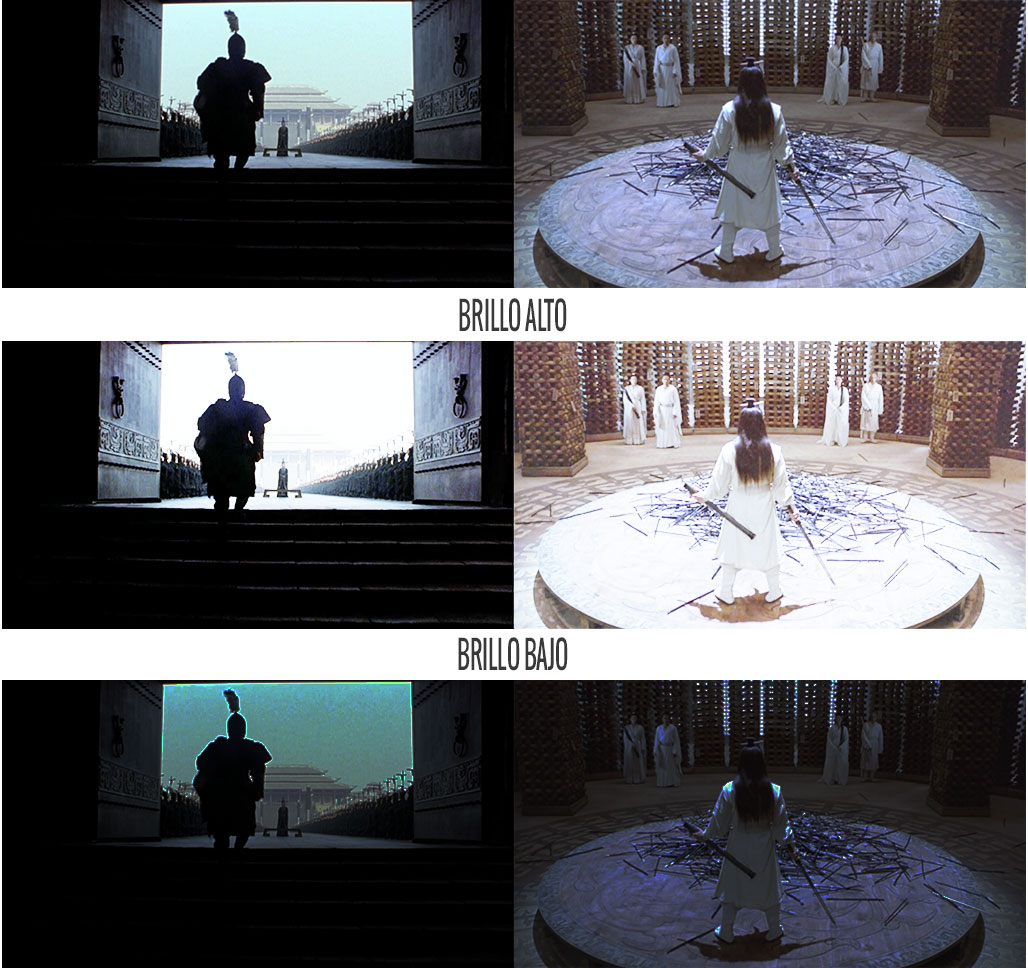 En la siguiente imagen vemos el brillo de las escenas. El brillo se encarga del nivel de retroiluminación de la escena. En los televisores más viejos ocurrirá que el negro se ve lavado; en los más modernos solo afecta las zonas de información de la escena. Como podemos ver en el ejemplo de la mitad, subir mucho el brillo puede destruir la información que existe en las áreas más iluminadas, las áreas oscuras que tienen un poco de información generan ruido digital y las zonas de color se desaturan por la contaminación del blanco.
