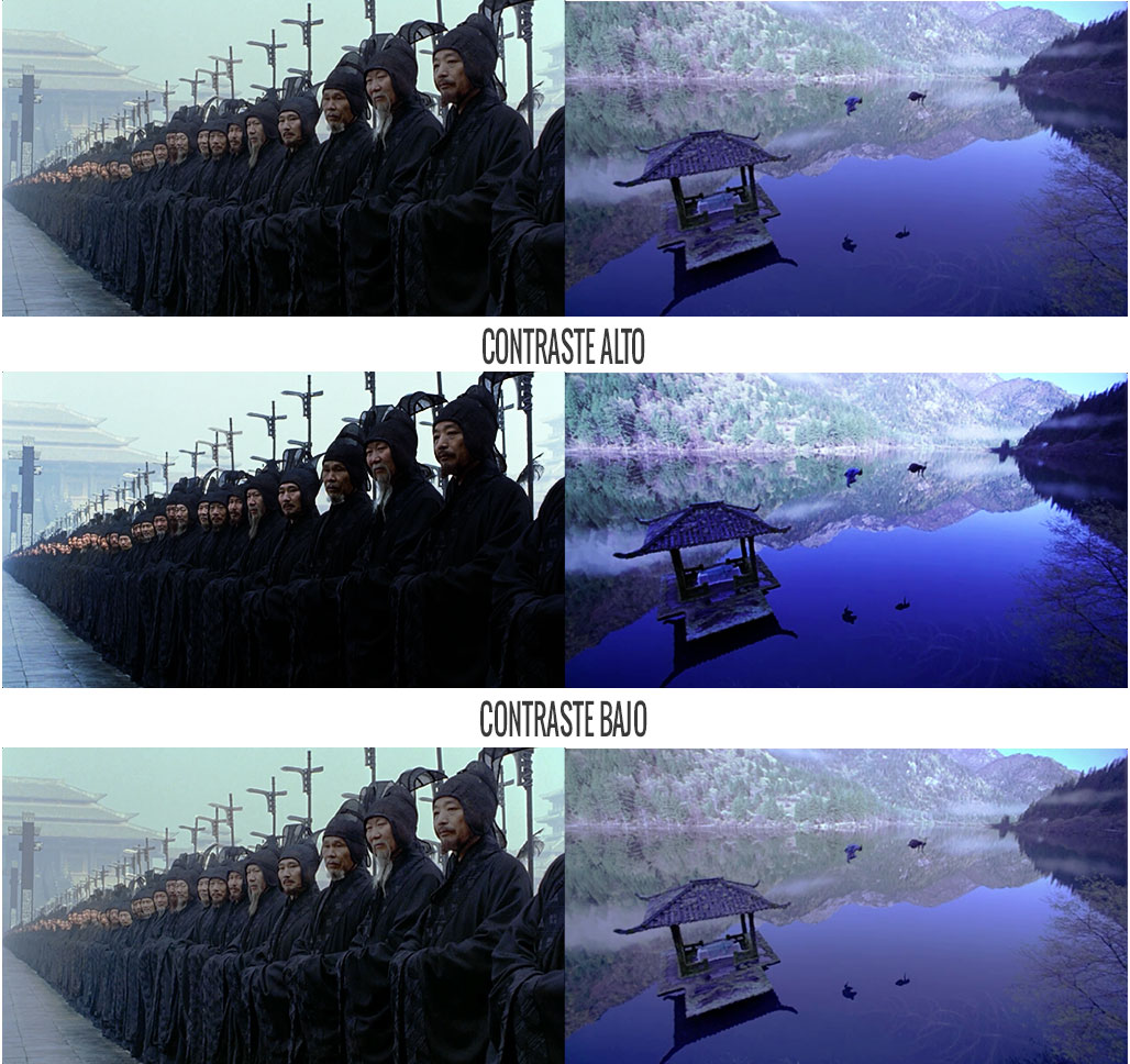 Por el contrario, si se baja demasiado el contraste, se podrá notar más información en las luces y las sombras, pero se sacrifican los colores vivos de la imagen. En la parte inferior del ejemplo visual vemos que el lago pierde color, y en la escena de los consejeros parece que la imagen se suaviza, y se comienza a perder detalle en la textura del suelo y en los rostros de los personajes. La disminución de contrastes puede crear ruido digital sobre los colores y grises más oscuros ya que necesita inventar información de degradé.
