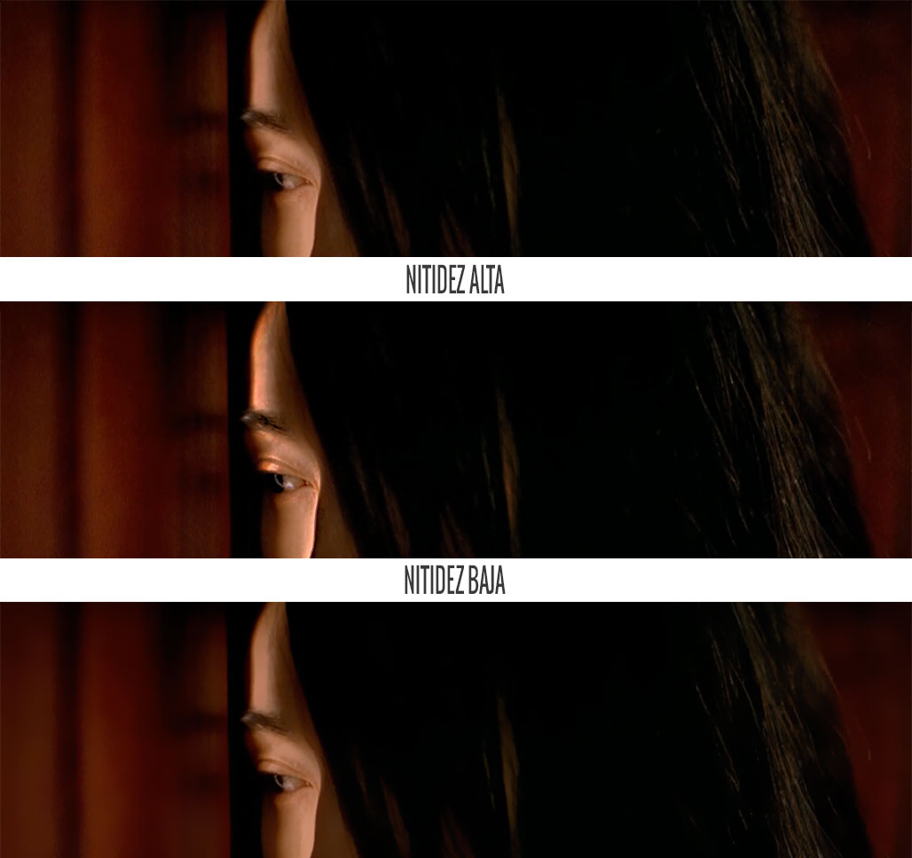 Si se fijan en la imagen de arriba, la toma original parece tener ruido sobre la zona de madera y el rayo de luz sobre el rostro de la mujer es bien degradado. Pero si la nitidez se sube mucho (imagen de la mitad) no sólo se acentúa el ruido en la madera, sino que también se forma un ‘parche’ en el degradé de luz porque el televisor intenta definir los bordes de esa escala de luz, agregándoles ruido digital a esas zonas que quiere definir. Y cuando se baja demasiado la nitidez (imagen de abajo) se pierde mucho ruido de la imagen, pero sigue intentando definir bordes, por lo que los degradés de luz y color quedan con ‘parches’ empastelados.