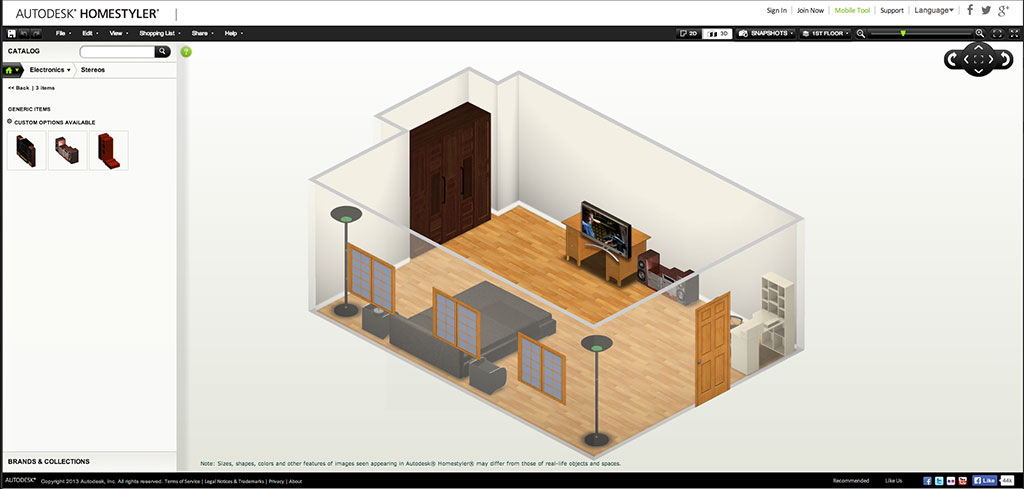 Homestyler es una herramienta que se puede utilizar desde el navegador. También cuenta con aplicaciones para dispositivos móviles. La plataforma tiene varias herramientas y modelos prediseñados para ubicar los objetos desde un plano 2D sobre una habitación, que el usuario arma a la medida del espacio que quiere decorar. Tan sólo basta con ubicar las lineas (en metros o pies) sobre el lienzo, y el programa se encarga de ir cerrando los espacios.