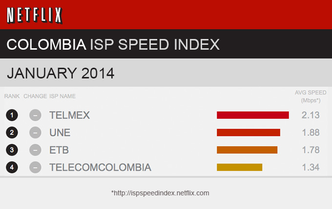 El análisis del índice de velocidades de ISP de Netflix (proveedores de servicios de Internet) se realiza cada mes y permite comparar fácilmente los proveedores de un país o internacionalmente. Los datos mostraron que la mejor experiencia de conexión la ofrecen Chile y Brasil. En Colombia, los datos mostraron que el mejor servicio hasta enero lo ofrece Telmex (Claro) con un promedio de 2,13 Mbps, seguido por Une y ETB.